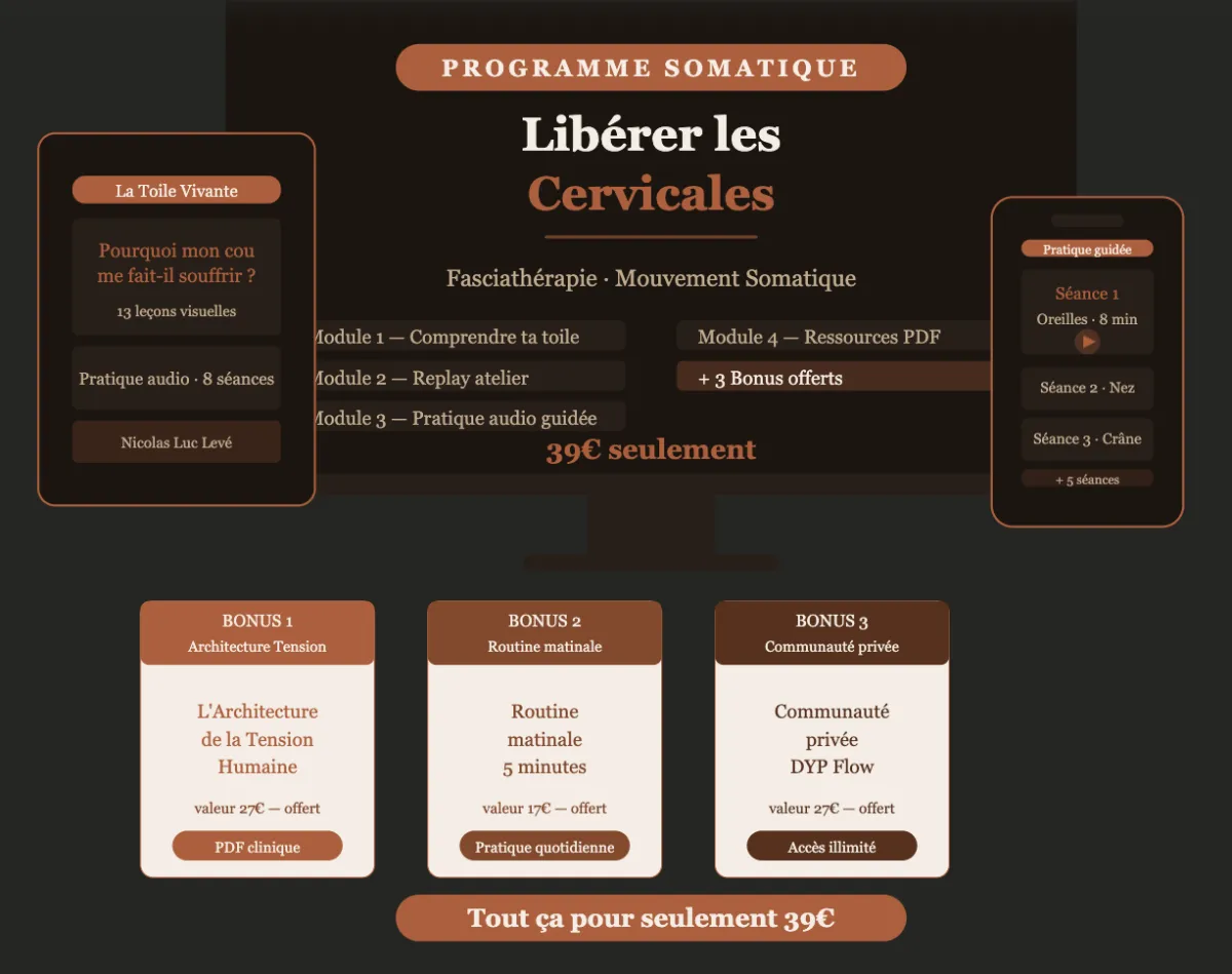 C'est la raison pour laquelle j'ai créé Libérer les Cervicales. Pour mettre cette approche entre les mains de toutes les personnes qui souffrent — pas seulement celles qui peuvent venir dans mon cabinet.